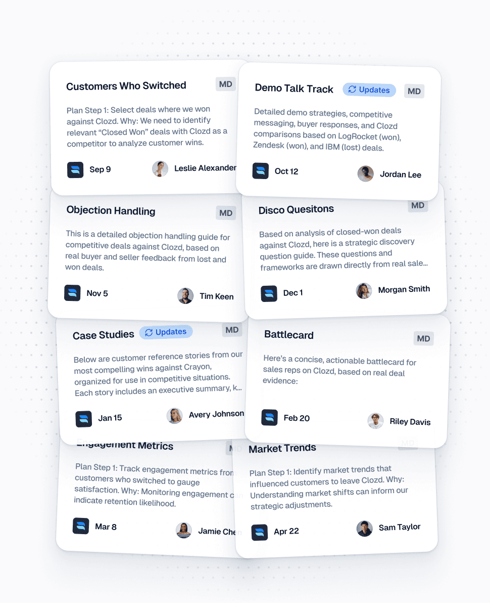 Generate battlecards, objection responses, and competitive messaging that reflect what is working in real deals. AI will automatically suggest updates when new intel rolls in.