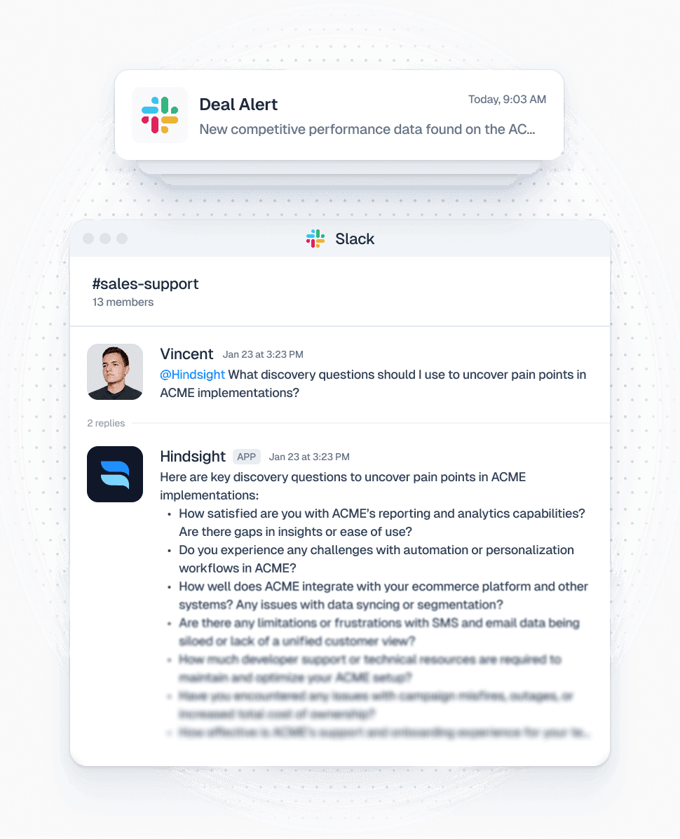 Reps get verified content in Slack without hunting through docs. Pull a battlecard with /assets [competitor] or ask a question by tagging @Hindsight.
