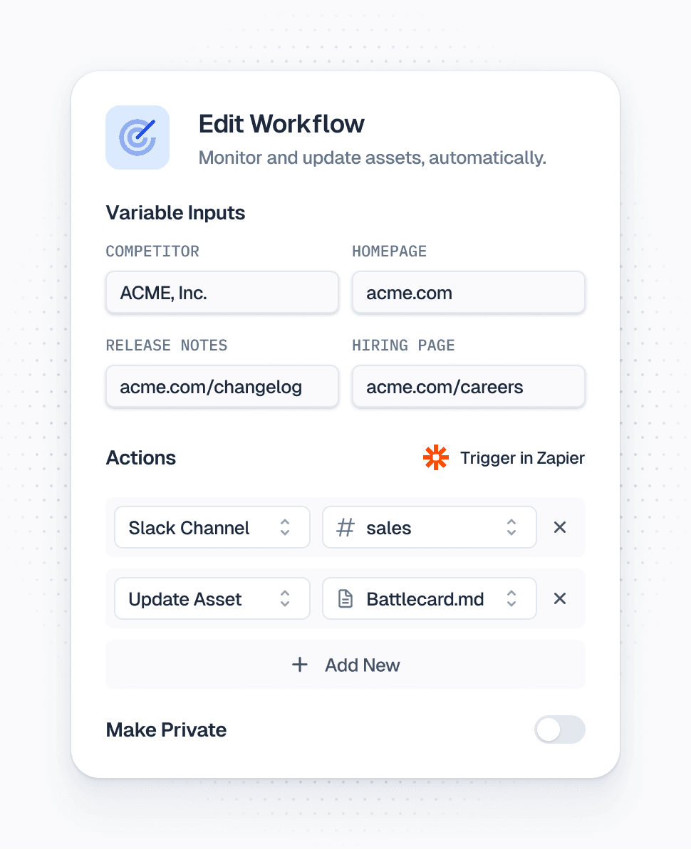 Create competitive assets in Hindsight, bring in what you already have from tools like Drive or Notion, and track competitors online. Hindsight helps keep things up-to-date and accurate.