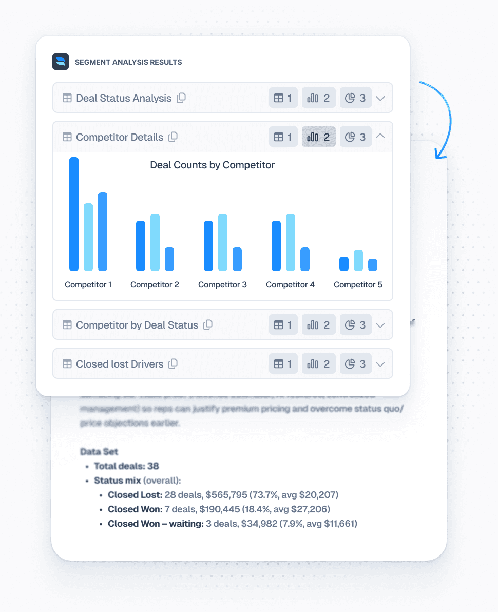 Hindsight segments deals and surfaces what is changing over time. See which themes, competitors, objections, and decision drivers correlate with outcomes, backed by charts and source evidence.