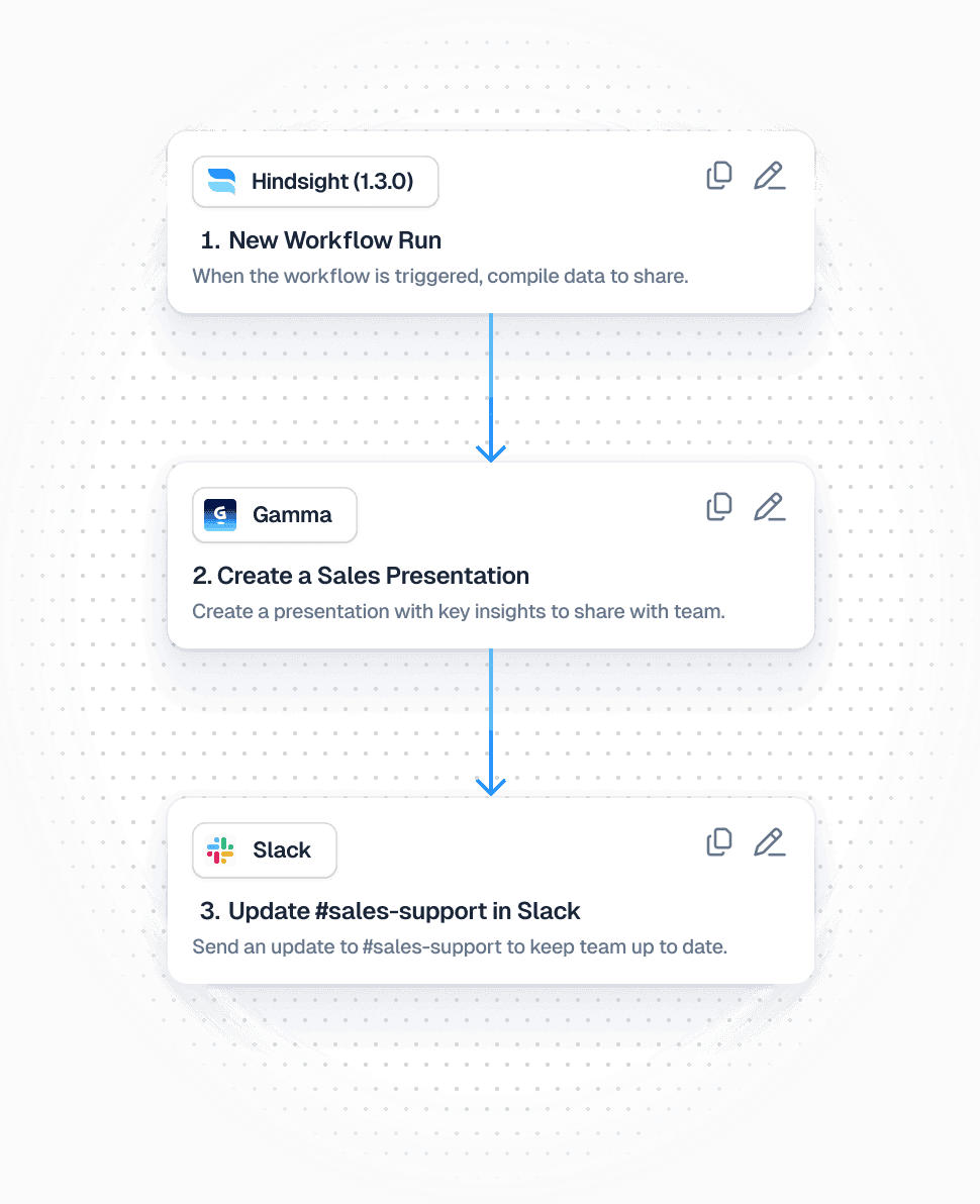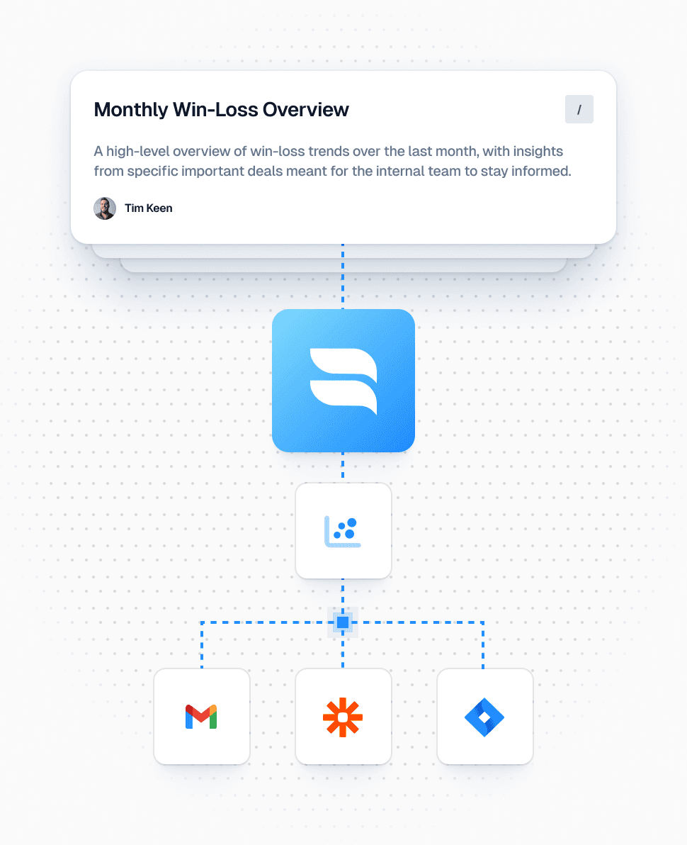Post to Slack channels or DMs, email stakeholder lists, create or update assets, or send outputs to Zapier for downstream automation. Workflows are customizable so you can match your operating cadence.